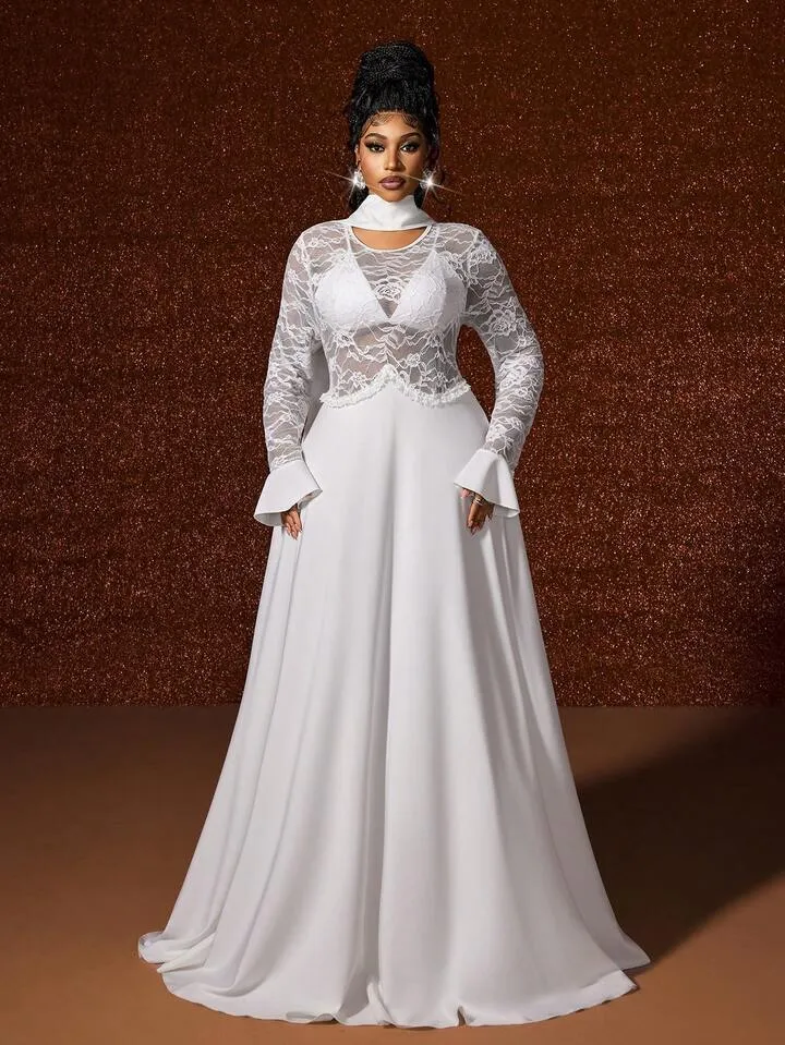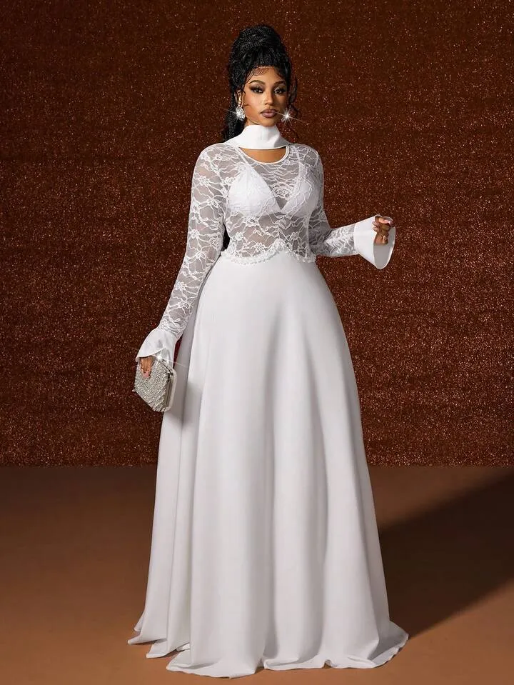 Maweii Plus-Size Women's Sexy And Elegant Lace-Patterned Fabric Spliced With Solid Color Fabric, Featuring A Small Lace Trim At The Waist; Perfect For Parties And Gatherings.Summer,Sexy,Vacation,Leopard,Cheetal Christmas, And New Year's.